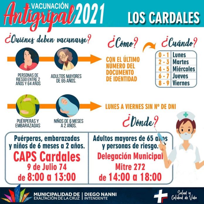 Desde este lunes 10 de mayo los vecinos de Capilla del Señor y Los Cardales mayores de 65 años, y las personas con factores de riesgo entre los 2 y 64 años deben vacunarse en el CAPS Capilla, ubicado en la calle Rivadavia 641 de 14 a 18 horas.