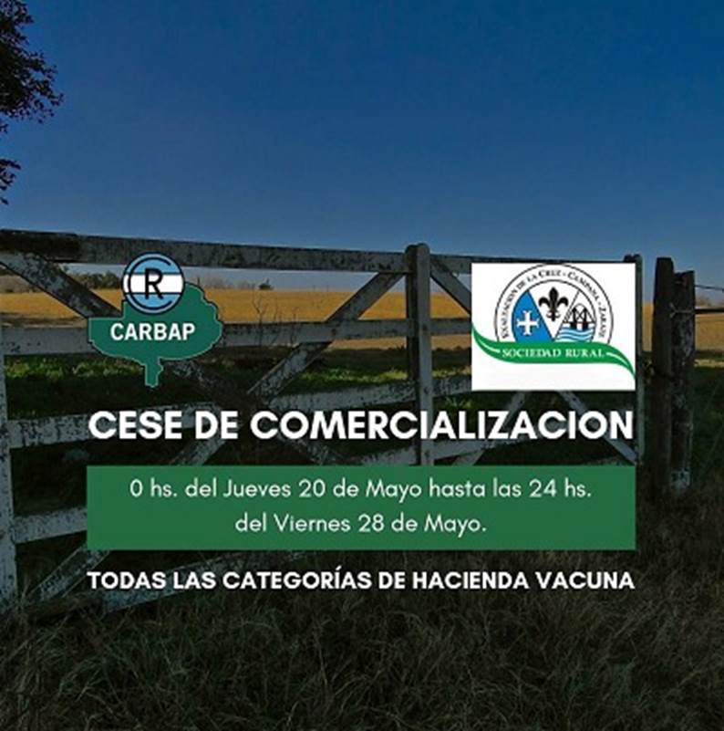 La Mesa de Enlace convocará a un cese de comercialización de hacienda desde este jueves 20/5) y se extenderá hasta el viernes 28 del corriente mes. Lo decidiò la Mesa el cese de comercialización de carne vacuna, luego de más de una hora de reunión virtual, los integrantes de la Mesa de Enlace decidieron organizar un cese de comercialización de todas las categorías de hacienda vacuna, desde las 0 horas del jueves 20 de mayo hasta las 24 del viernes 28 de mayo, en rechazo al cierre de las exportaciones de carne vacuna que anunció el Gobierno de Alberto Fernández.