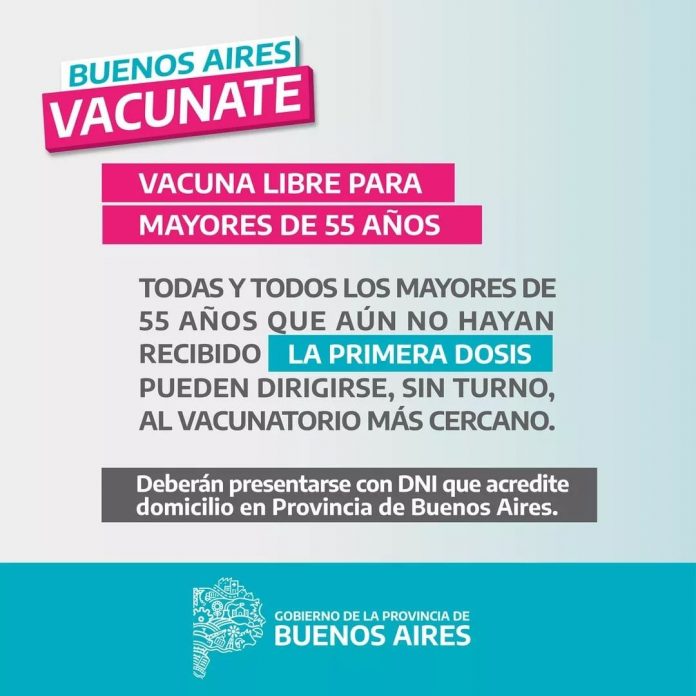 Interés general VACUNACIÓN LIBRE PARA MAYORES DE 55 AÑOS By epocadigital - 18/06/2021 0 745 Facebook Twitter Google+ Pinterest WhatsApp DESDE EL 19/6. Se podían presentar todos los vecinos mayores e 55 años, en los vacunatorios instalados. Es para recibir la primera dosis y, muy imporante: ¡sin inscripción previa! Debe presentarse con DNI que acredite domicilio en la Provincia.
