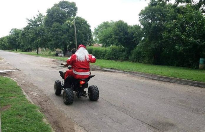 Así como ves, el funcionario en su papel de Papá Noel, circuló por las calles en un cuatriciclo sin identificacón, sin portar el casco reglamentario y llevando además en una parte de su paseo, a un menor t sin casco también, sobre el vehículo con el serio peligro que implicó.