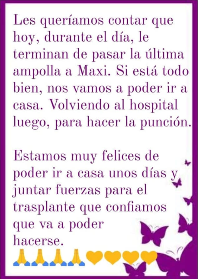 La mujer se mostró sumamente agradecida por los mensajes de cariño y por toda la ayuda recibida. “La mayoría de personas siguen demostrando el cariño, con mensajes de amor. Realmente, estamos felices. Max también está al tanto de todo, está re emocionado. Estamos emocionados, sabemos que empieza un camino largo, que funcione la medicación, el trasplante y la recuperación. La felicidad, el agradecimiento, es infinito. Nos emociona lo que despertó Max en la gente, desde el que tenía mucho, al que tenía poquito o casi nada para dar”, dijo la tía de Maxi.