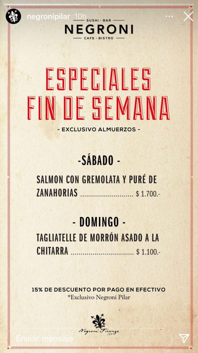 Espectáculos EN NEGRONI, PILAR. By epocadigital - 28/08/2021 0 711 Facebook Twitter Google+ Pinterest WhatsApp DISFRUTÁ DE LOS PLATOS Y DE UN BUEN MOMENTO.