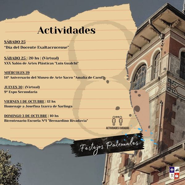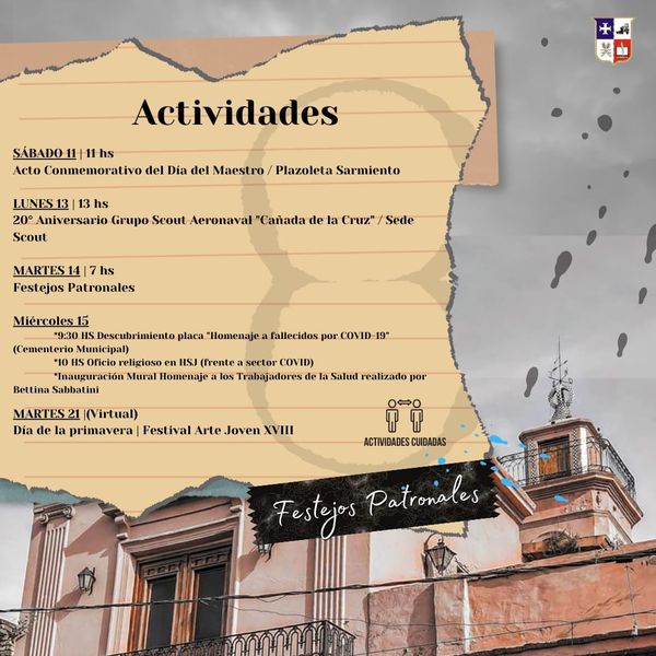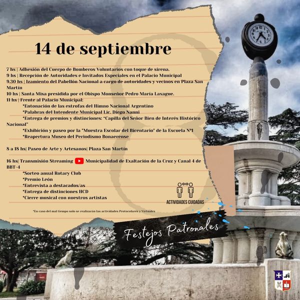 Acá podés conocer el cronograma oficial para el 14 de Septiembre, por los Festejos Patronales de Exaltación de la Cruz, con actividades virtuales y al aire libre y con estricto distanciamiento social y respetando medidas sanitarias vigentes.