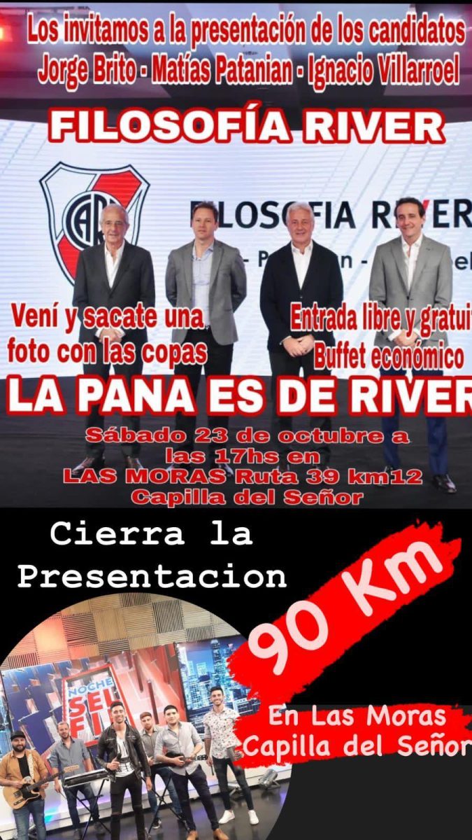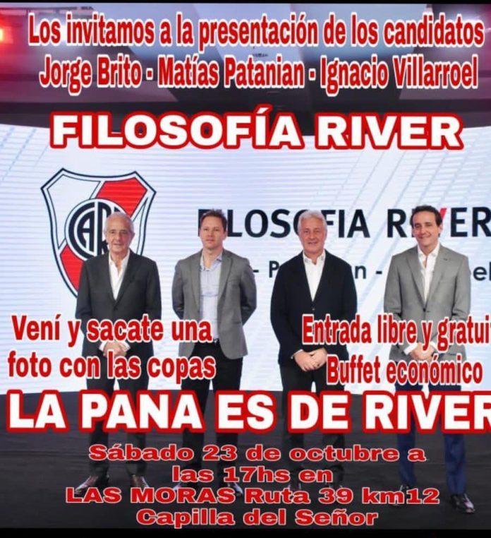 Entidades Elecciones en River, presentación de la lista Filosofía River en Las Moras By epocadigital - 22/10/2021 0 768 Facebook Twitter Google+ Pinterest WhatsApp ESTE SABADO 23. LA ENCABEZAN JORGE BRITO, MATÍAS PATANIAN E IGNACIO VILLARROEL. Atención hinchas y socios de los Millonarios. En Las Moras a las 5 de la tarde.