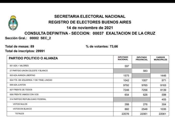 Política Elecciones 2021. resultados oficiales en Exaltación. Juntos le ganó al Frente de todos por 1024 votos. By epocadigital - 23/11/2021 0 860 Facebook Twitter Google+ Pinterest WhatsApp EL ESCRUTINIO DEFINITIVO. VOTOS PARA CONCEJALES Y CONSEJEROS ESCOLARES. JUNTOS: 9163 VOTOS FRENTE DE TODOS: 8139 VOTOS TOTAL DE VOTANTES: 22.061