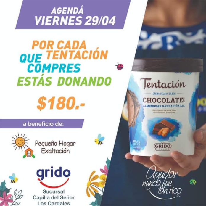 En Heladerías Grido sumaron su colaboración para el Pequeño Hogar de Capilla del Señor y Los Cardales. Todos aquellos postres de un litro de la línea Tentación que se vendan, Grido donaba $180 a la citada entidad.