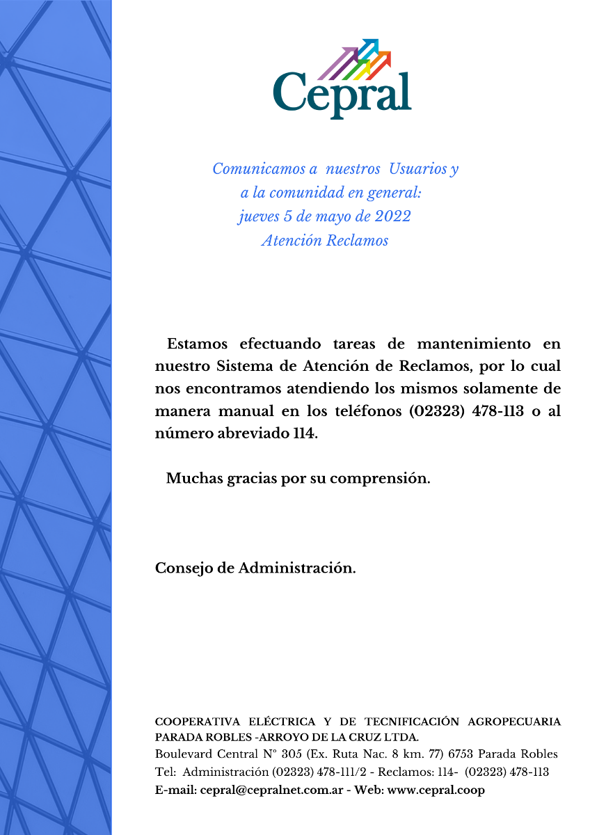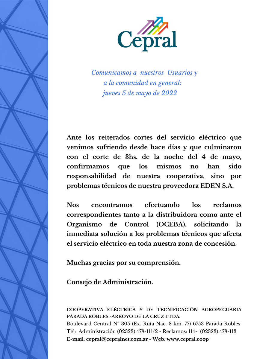 Aquí Parada Robles POR CORTES DE ENERGÍA, CEPRAL RECLAMÓ A EDEN Y A OCEBA By epocadigital - 05/05/2022 0 695 Facebook Twitter Google+ Pinterest WhatsApp INFORMARON DESDE LA COOPERATIVA.