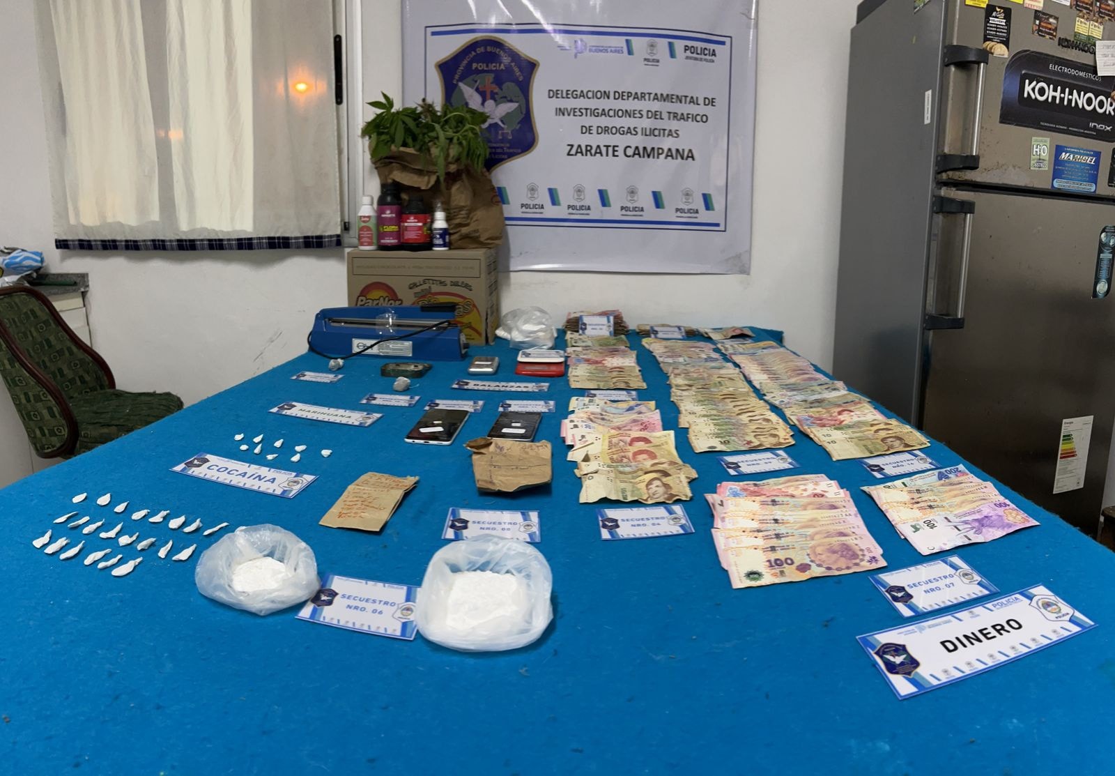 La persona detenida ha sido una mujer de 41 años y en el lugar se encontraron dos envoltorios con picadura de marihuana, un recipiente con cogollos y seis plantas de cannavbis sativa; 32 envoltorios y dos bolsas de nylon conteniendo un peso total de 162 gramos de clorhidrato de cocaina y dos bolsas con 330 gramos de sustancias de corte; 28.100 pesos en efectivo y en billetes de distinta denominación; dos teléfonos celulares; dos balanzas de precisión; una termoselladora y anotaciones de interés. Los procedimientos, se se realizaron en conjunto con la delegación de drogas ilícitas de Zárate-Campana.
