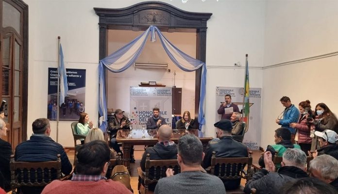 Afiliados de las agrupaciones gremiales cubrieron el salón del Concejo Deliberante a modo de respaldo a la firma del convenio colectivo, primero luego de siete años, en el que arribaron a un acuerdo las tres entidades sindicales y la municipalidad. “Hemos recorrido un largo camino, costó mucho, debimos superar obstáculos y siempre tuvimos la decisión de pelear por defender los derechos de los trabajadores”, afirmó Nanni. Rivero por su lado al hablar resaltó la postura de Nanni como intendente, así como criticó ironizando a otros intendentes a quienes tildó de “amarillitos y gorilas” en clara alusión a los intendentes que forman parte de Juntos por el Cambio. El dirigente admitió después que “la situación actual es muy difícil, casi caótica”, y que sería más aún si intendentes y gobernador no fueran peronistas.