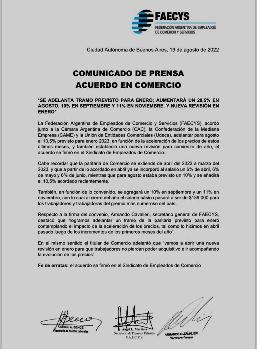 Empleados de ComercioInterés general Empleados de comercio, el aumento previsto para enero se adelanta By epocadigital - 24/08/2022 0 627 Facebook Twitter Google+ Pinterest WhatsApp INFORMACIÓN IMPORTANTE. El acuerdo se firmó en el Sindicato de Comercio. En enero de 2023, nueva revisión.