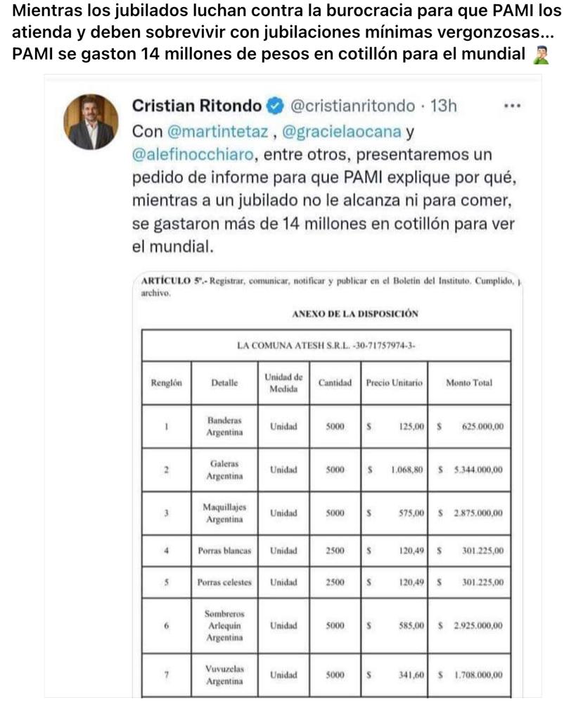 Política Mientras los jubilados padecen, el PAMI gasta 14 millones en cotillón del Mundial By epocadigital - 24/11/2022 0 616 Facebook Twitter Google+ Pinterest WhatsApp