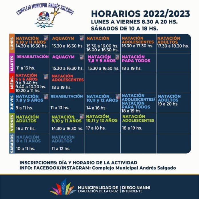 Interés general DÍAS Y HORARIOS DE PILETA EN CAPILLA DEL SEÑOR By epocadigital - 14/12/2022 0 570 Facebook Twitter Google+ Pinterest WhatsApp EN CAPILLA EN EL COMPLEJO ANDRÉS SALGADO.. Continúan las las actividades en el Complejo Andrés Salgado, que pasado el temporal, ya funciona normalmente. Encontrá más información en la página de Deportes Exaltación.