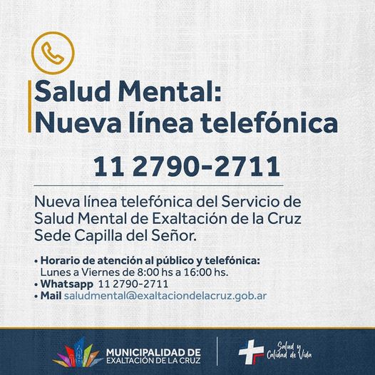 El servicio de Salud Mental del municipio de Exaltación de la Cruz, cuenta con una nueva línea telefónica en su sede de Capilla del Señor.A partir de ahora podés comunicarte al 1127902711.