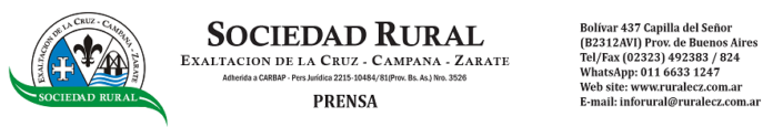Se informa a los productores ganaderos que el día 6 de Marzo de 2023 inicia la Campaña de Vacunación de Otoño de Aftosa y Brucelosis para la totalidad del rodeo bovino en los Partidos de Exaltación de la Cruz, Zarate , Campana , Escobar , Pilar y zona de Islas. La fecha prevista de finalización es el día 5 de Mayo de 2023. Para coordinar turnos de vacunación y abonar aranceles contactar a las siguientes oficinas del Ente Sanitario de Vacunación: A) Sede de la Sociedad Rural en Capilla del Señor: (Bolívar 437) mail: gerencia@ruralecz.com.ar Telefono: 02323-492383/492824/581084 B)Sede de la Sociedad Rural en Zárate (Conesa 58) mail: sedezarate@ruralecz.com.ar Teléfono: 03487-448237 C) Delegación Sociedad Rural en Pilar/Escobar: Sra. Graciela Cavión mail: pilar-escobar@ruralecz.com.ar Teléfono: 011-15-5855-5383