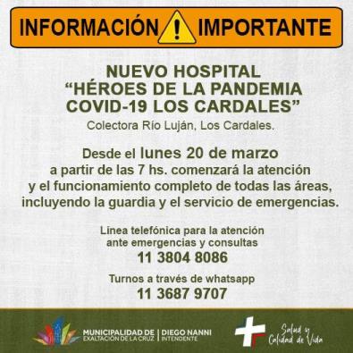 Inaugurado tiempo atrás con la presencia del presidente Alberto Fernández, restaba que le fuera incorporado equipamiento. Finalizada esa etapa, se ha informado desde el nuevo Hospital Héroes de la Pandemia Covid -19 de Los Cardales, que a partir del lunes 20 de marzo desde las 7 horas, comenzará la atención y funcionamiento completo de todas sus áreas, incluyendo la Guardia y el Servicio de Emergencias.