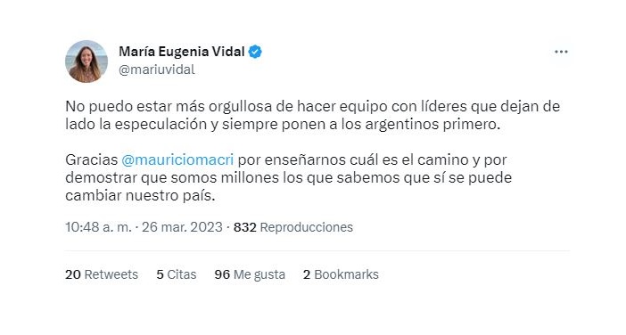 La ex gobernadora de la Provincia de Buenos Aires, María Eugenia Vidal, se hizo eco del anuncio de Mauricio Macri, y respaldó su decisión. “No puedo estar más orgullosa de hacer equipo con líderes que dejan de lado la especulación y siempre ponen a los argentinos primero”, escribió la dirigente del PRO y candidata a Presidente de Juntos por el Cambio.