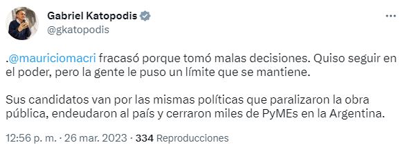 “Mauricio Macri fracasó porque tomó malas decisiones. Quiso seguir en el poder, pero la gente le puso un límite que se mantiene. Sus candidatos van por las mismas políticas que paralizaron la obra pública, endeudaron al país y cerraron miles de PyMEs en la Argentina”, tuiteó el ministro.