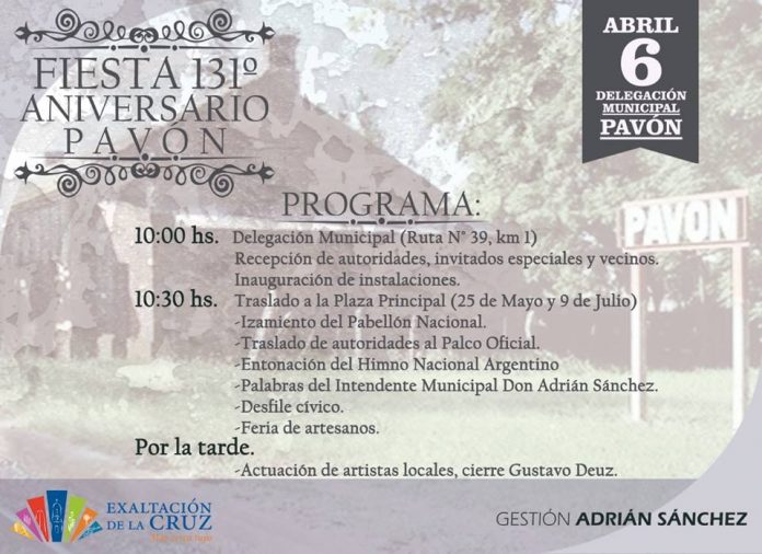 Este es el cronograma de los actos para celebrar el aniversario de Pavón, el sábado 6 de abril.