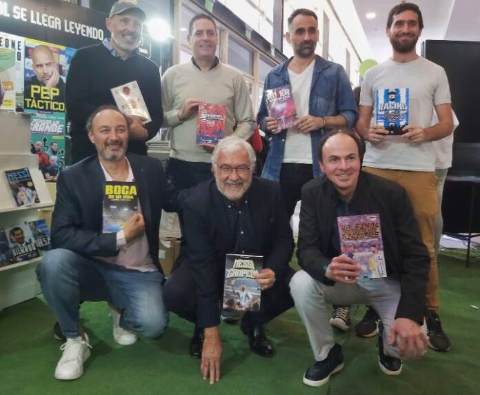 Arriba: Néstor López escribió “365 Historias de Independiente”; Alejo Iriart escribió “365 Historias de San Lorenzo”; Ernesto Provitilo autor de “River siempre está”; Nicolás Zuberland el autor de “365 Historias de Racing”.
