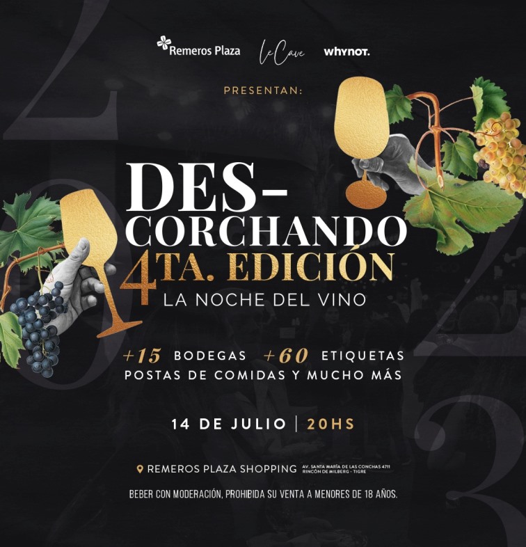 Este viernes 14 de julio, se lleva a cabo en el centro comercial de Tigre, una nueva edición de Des-corchando, evento que contará con la presencia de las principales marcas de vino del país. El acontecimiento se desarrollará entre las 20:00 – 00-00hs. En el circuito gastronómico del shopping, ubicado en Avenida Santa María de las Conchas 4711, Tigre, Provincia de Buenos Aires.