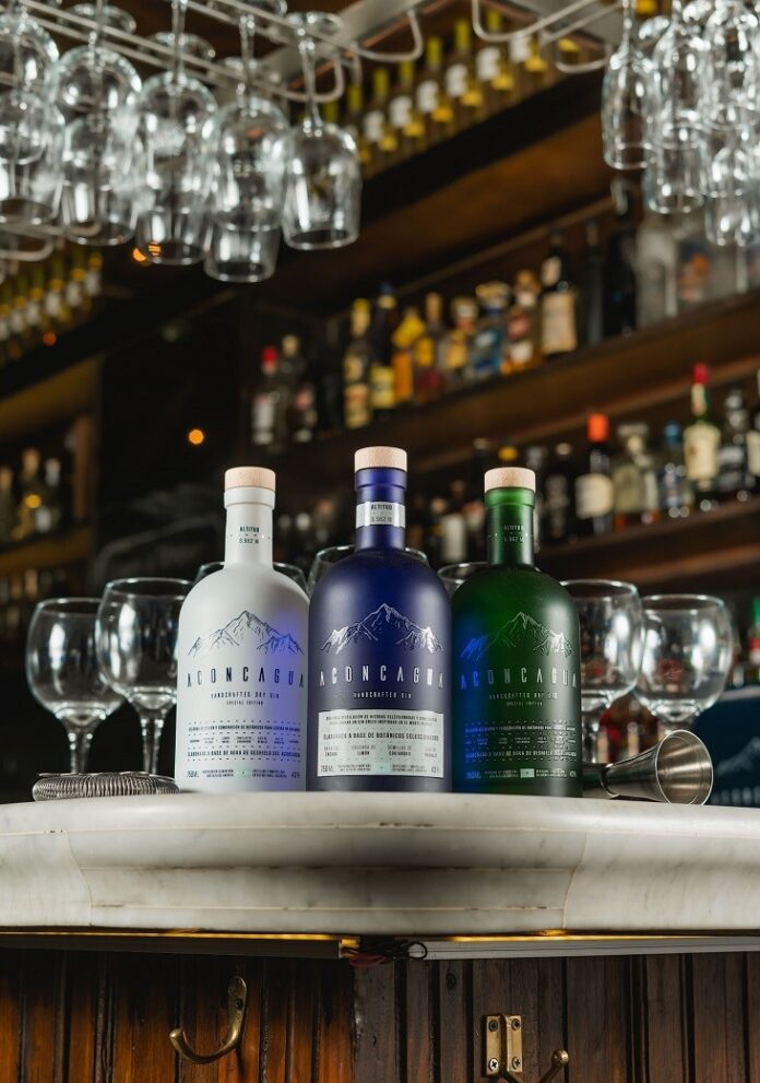 En sus inicios, Aconcagua Gin salió al mercado con el desarrollo de su clásica e innovadora botella azul, denominada London Dry de 750 ml, compuesta por siete botánicos característicos: bayas de enebro, semillas de coriandro, raíz de angélica, raíz de regaliz, almendra, cassia y cáscara de Limón.