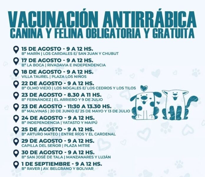Barrios CAMPAÑA DE VACUNACIÓN ANTIRRÁBICA POR LOS BARRIOS By epocadigital - 16/08/2023 0 628 Facebook Twitter Google+ Pinterest WhatsApp AGENDÁ. Comenzó la la vacunación antirrábica, canina y felina, por los barrios del distrito organizada por la Municipalidad de Exaltación de la Cruz. Anotá el cronograma. Recordá que la vacunación es gratuita y obligatoria. .