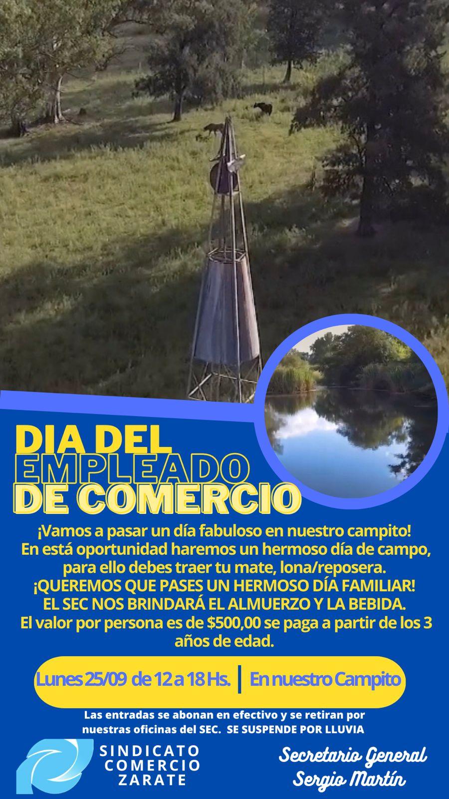 Empleados de ComercioEntidades El festejo por el Día del Empleado de Comercio, el 25 de septiembre By epocadigital - 18/09/2023 0 928 Facebook Twitter Google+ Pinterest WhatsApp LA CELEBRACIÓN ORGANIZADA POR EL SINDICATO EMPLEADOS DE COMERCIO, FILIAL ZÁRATE. La ubicación es dentro del Partido de Zárate, en el Km 10 de Ruta Provincial 193, a 3500 metros de Ruta Panamericana altura Km 85.- ¡No faltes!