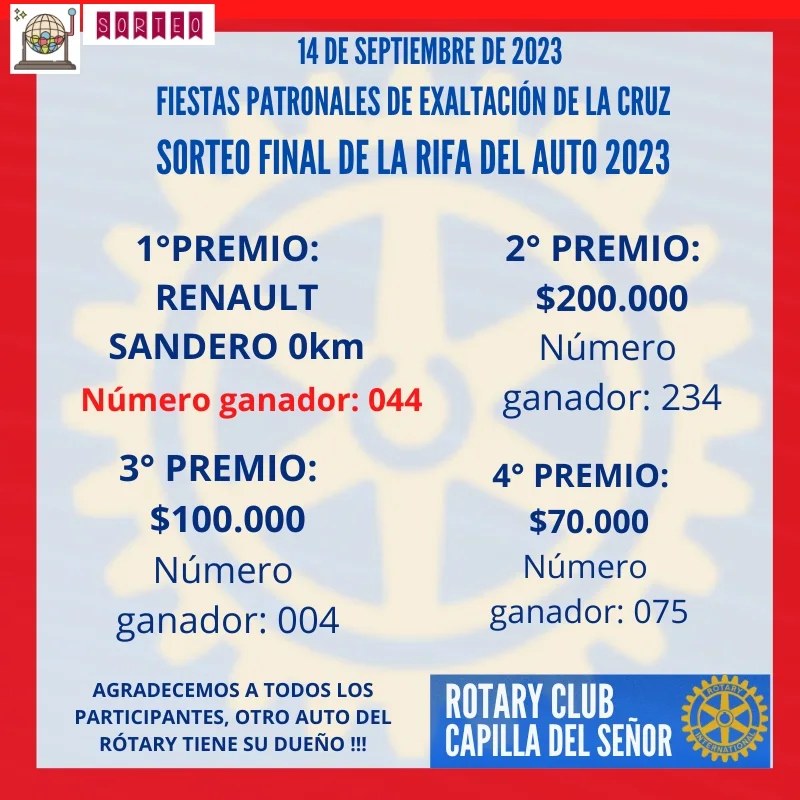 El sorteo fue realizado el 14 de septiembre en el mismo escenario donde se desarrollaron distintos espectáculos y entregas de premios. El sorteo lo fiscalizó la escribana Paola Peluso a quien el Capilla Rotary, agradeció “su servicio a lo largo de todo el año”.