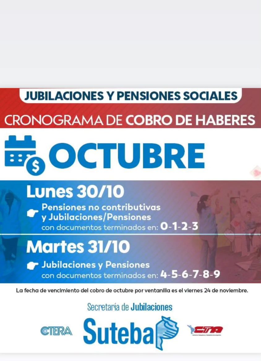 Interés general SUTEBA. CUANDO SE COBRAN JUBILACIONES Y PENSIONES By epocadigital - 25/10/2023 0 708 Facebook Twitter Google+ Pinterest WhatsApp INFO ÚTIL.
