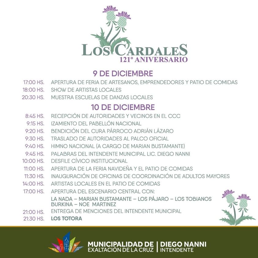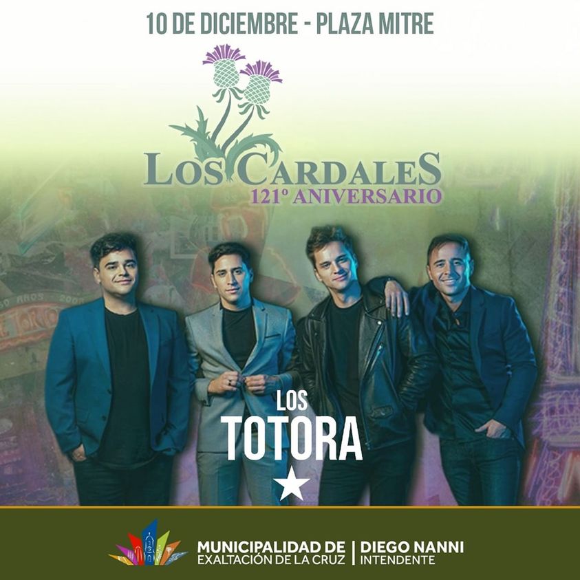 Este fin de semana 9 y 10 de diciembre, Los Cardales festeja su 121 aniversario. Se han programado diversas actividades centralizados en la Plaza Mitre, para pasarlo muy bien en familia, con amigos y vecinos. Habrá espectáculos con la presentación de artistas y bandas locales, y el cierre estará a cargo del popular grupo Los Totora.