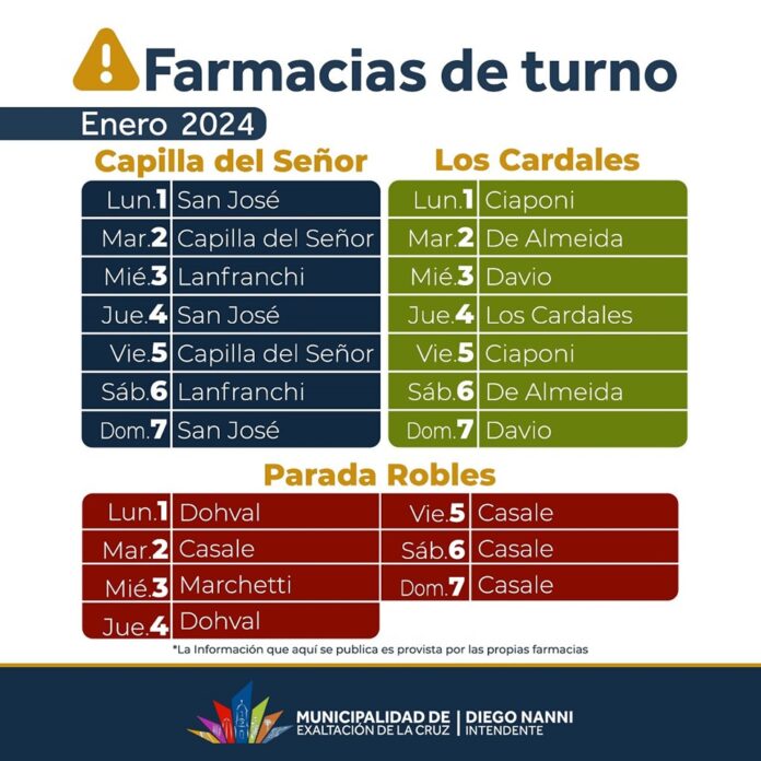 Barrios Turnos de las farmacias en Exaltación de la Cruz By epocadigital - 02/01/2024 0 836 Facebook Twitter Google+ Pinterest WhatsApp INFO ÚTIL.