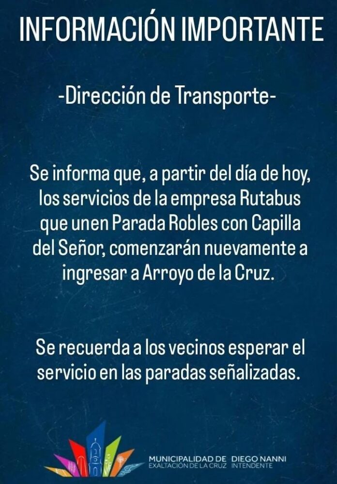 En tal sentido, desde el municipio se informó que desde el 1 de marzo, el servicio de Rutabus que une Capilla del Señor con Parada Robles, volvió a ingresar a Arroyo de la Cruz.
