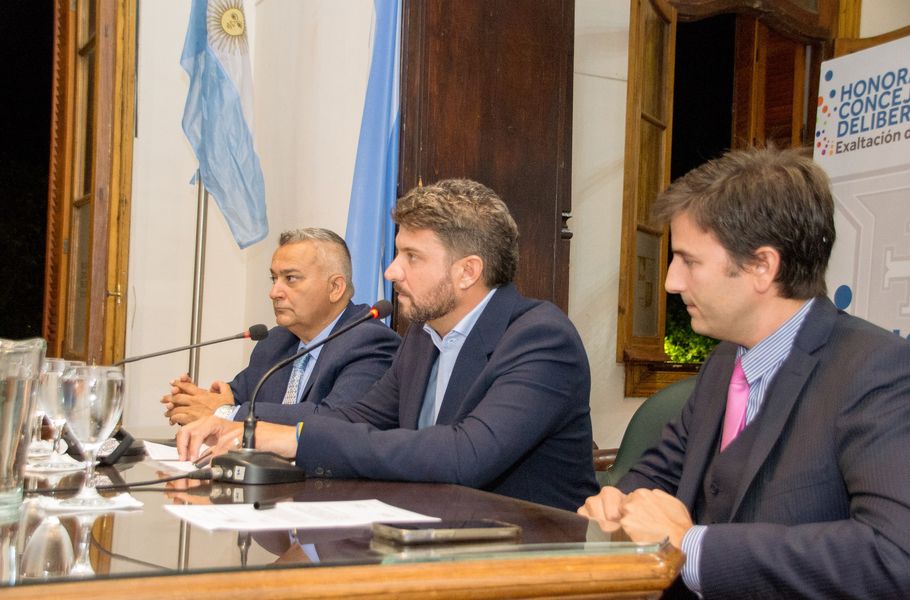 El intendente Nanni, el presidente del HCD, Raúl Sancho y el secretario del cuerpo César Franzanti, durante la apertura de las sesiones ordinarias.