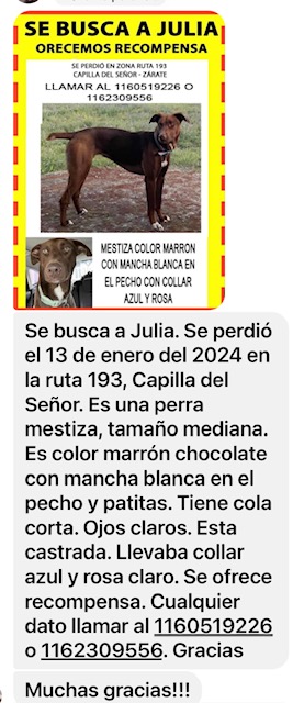 Aquí Los Cardales Un perrito perdido, la angustia de una familia By epocadigital - 06/03/2024 0 771 Facebook Twitter Google+ Pinterest WhatsApp SE BUSCA A JULIA.