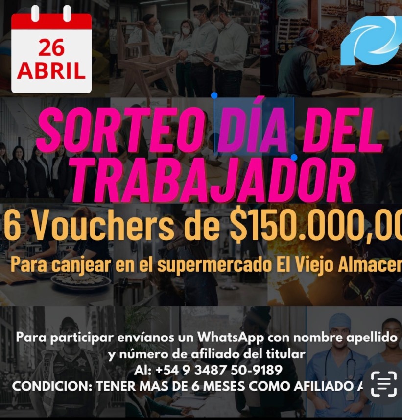 Lo que tenés que saber Para el Día del Trabajador, gran sorteo del Sindicato Empleados Comercio Zárate By epocadigital - 24/04/2024 0 648 Facebook Twitter Google+ Pinterest WhatsApp PARA AFILIADOS DE ZÁRATE Y A SU VEZ AQUELLOS QUE RESIDEN EN EXALTACIÓN DE LA CRUZ. Se sortean este 26 de abril, nada menos que 6 vouchers de 150 mil pesos cada uno, para canjear en el comercio El Viejo Almacén. Fijate las condiciones y participá!