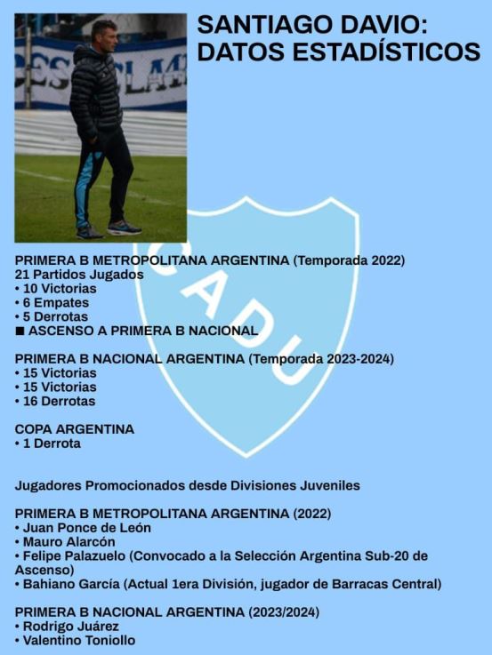 Davio de 39 años, dejó de jugar en 2018, su último club entre los varios por los que pasó fue Leandro Alem en la Primera C. Sus comienzos como DT “fue con los juveniles del CADU, en 5ta división entre 2028 y 2019; cuarta desde 2019 a 2020, la reserva en 2021″, hasta sumarse como asistente de Merlo en 2022.