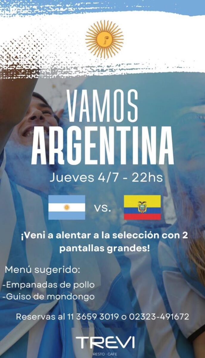 Y en Trevi, el tradicional y tan conocido restaurante-café de Capilla del Señor, han preparado un programa bien tentador, para reunirse en familia o entre amigos, a mirar a través de dos pantallas grandes de TV, el decisivo partido de Argentina ante Ecuador, y desde ya, disfrutar del menú preparado.