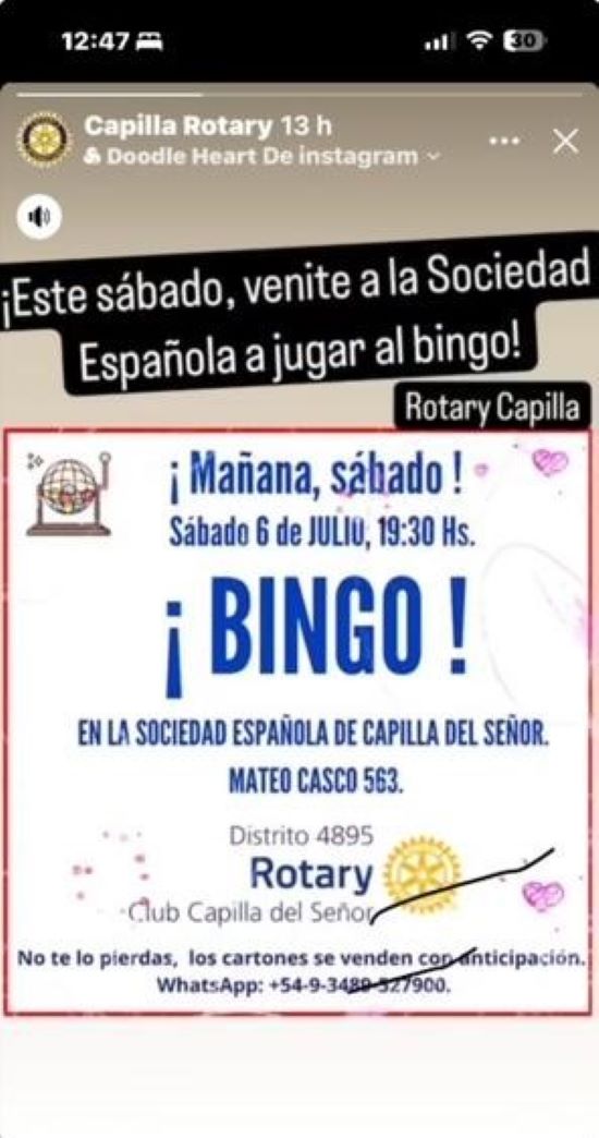 Barrios ¡Bingo!, el Rotary de Capilla del Señor te espera en la Sociedad Española By epocadigital - 06/07/2024 0 500 Facebook Twitter Google+ Pinterest WhatsApp ESTE SÁBADO 6 DESDE LAS 7 Y MEDIA DE LA TARDE.