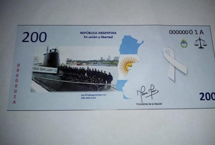 Abigail Tenaglia, Yuli Spinelli, Daiana Medina, Analía Siri y Melisa Tomino, alumnas de cuarto año diseñaron un billete de 200 pesos, con imágenes del submarino argentino ARA San Juan, en homenaje a sus tripulantes y para conmemorar la fecha en la que se cumplió un año de su desaparición.