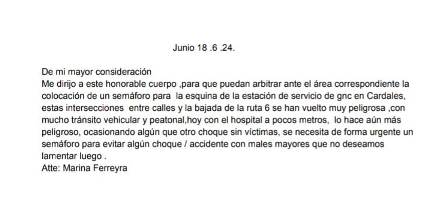 La necesidad de colocar nuevos semáforos en Cardales, había quedado reflejada en la iniciativa presentada ante el Concejo Deliberante por la vecina capillense y militante radical Marina Ferreyra quien señaló, “entre los meses de febrero y marzo pasados, tuve una reunión con Maxi Gutiérrez del municipio, donde le expresé la necesidad de colocar semáforos. Gutiérrez que respondió que era difícil colocarlo ahí en ese lugar. Después, esperé a que algún concejal se hiciera eco del problema y eso no ocurrió. Fue así entonces que presenté la nota 18 de junio. Más adelante pasé por el Concejo Deliberante y le pregunté al secretario legislativo que había ocurrido con la nota que presenté acerca del semáforo y en su caso, me contestó que “había pasado a comisión”, claramente el oficialismo se va a adjudicar la idea del semáforo que ahora colocaron; no importa, lo importante es que el semáforo se haya instalado”.