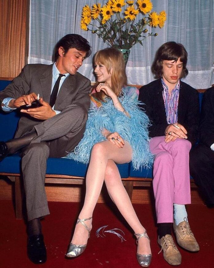 Por aquellos años, Faithfull era algo así como la groupie oficial de los Rolling Stones y musa de la dupla Richards-Jagger, además de ser descendiente del escritor austriaco Leopold von Sacher-Masoch, el que dio nombre al término masoquismo. Jagger la llevaba como su última conquista a toda fiesta o celebración. Acaso fuera para presumir. Hasta que coincidió en una reunión con el icónico actor Alain Delon, descrito en su momento como el hombre más bello del cine. Rápidamente, el francés desplegó su irremediable seducción, opacando a la estrella de rock.