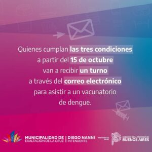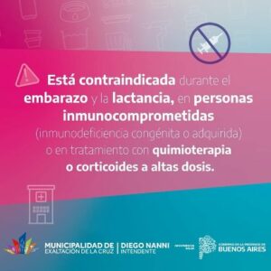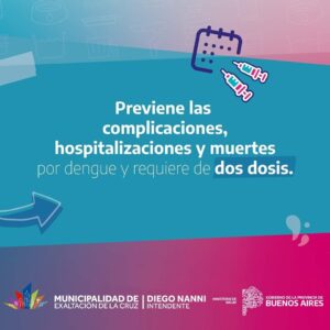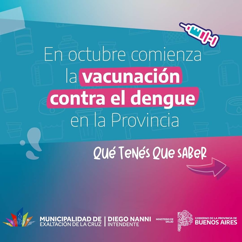 Exaltación de la Cruz, se suma a la campaña de vacunación de la provincia de Buenos Aires contra el Dengue. Está destinada a personas de entre 15 y 59 años, y que hayan contraído la enfermedad y residan en nuestro distrito.