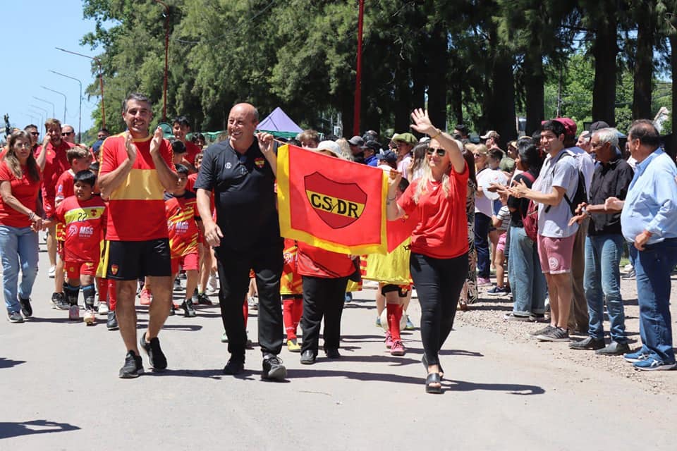 El desfile a pleno. En la imagen, representantes del Club Social y Deportivo Robles, con su presidente Humberto Balige a la cabeza.