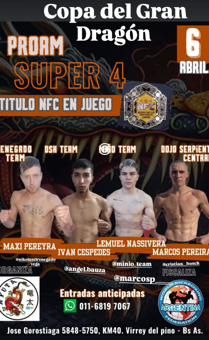 “Así que, si hacerme tanto la cabeza, cambié rápido de chip y me concentré en el combate del domingo 6 por el Súper 4, peleo en la categoría -71kg, es un Súper 4 áspero ante rivales fuertes, pero yo no soy menos que ninguno y lo voy a demostrar que me puedo llevar por delante a mis rivales; y no lo digo por arrogante, sino por saber el esfuerzo que le meto día a día para ser mejor que el día anterior. En este Súper 4 no quiero ni voy a dejar dudas, y la única forma de ganar va a ser buscando el K.O y es lo que voy a ir a buscar”, sostuvo muy confiado Nassivera.