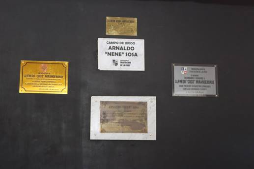 Durante el acto, fueron colocadas tres placas recordatorias dedicadas a Coco. Una por parte de la municipalidad, otra por su familia dee “Pelota de Trapo”, la escuela que fundó y que sigue adelante gracias al esfuerzo conjunto de la familia. La tercera placa correspondió al Club Social y Deportivo Capilla. Además, el Club Honor y Patria depositó una ofrenda floral, en reconocimiento a Coco.