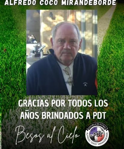 Alfredo “Coco” Mirandeborde, fallecido el año pasado, forma parte de lo mejor de la historia exaltacrucense. Su impronta la dejó a cada paso, respaldado en su capacidad, bonhonomia, intregridad, Coco formó vaya a sabere a cuantos chicos a través de la escuela municipal de fútbol Pelota de Trapo (PDT), con el paso del tiempo pasaron a compartir su pasión y compromiso sus hijos Majo, Luciano, así como empeñosos colaboradoress todos en pos del crecimiento de PDT.