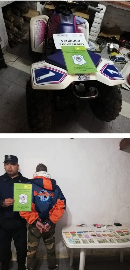 Luego de un llamado al 911, personal policial allanó una vivienda ubicada en el barrio El Remanso de Exaltación de la Cruz. Como resultado del mismo, fue aprehendido un hombre y se secuestraron vehículos robados, un auto Audi con pedido de captura, un Ford Fiesta tambien robado, autopartes, dos cuatriciclos Yamaha y documentación.