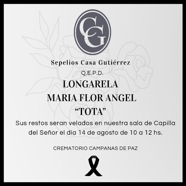 María Flor Angel Longarela, Tota, hasta el último día de sus 96 años, fue un ejemplo de todo lo que está bien en la vida. Su don de gente, el espíritu incolumne, su afán permanente por colaborar de la forma que fuera posible con su amado pueblo, Capilla del Señor, hicieron que fuera reconocida en forma permanente.