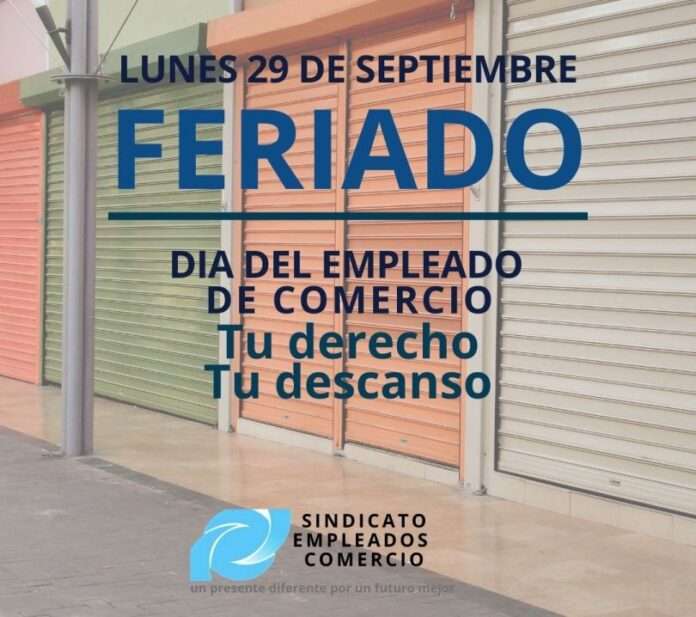 Entidades Lunes 29 de septiembre. Por el Día del Empleado de comercio, los negocios estarán cerrados By epocadigital - 03/09/2025 0 2956 Facebook Twitter Google+ Pinterest WhatsApp EL DÍA DEL EMPLEADO DE COMERCIO. 29 de septiembre. El Sindicato de Empleados de Comercio filial Zárate, hizo saber que dicho que los comercios permanacerán cerrados