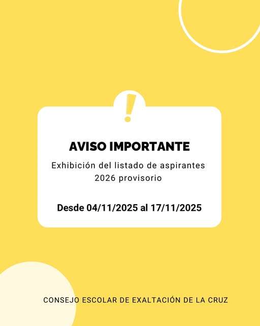 El Consejo Escolar de Exaltación de la Cruz informó. Exhiben el listado de aspirantes 2026 PROVISORIO.